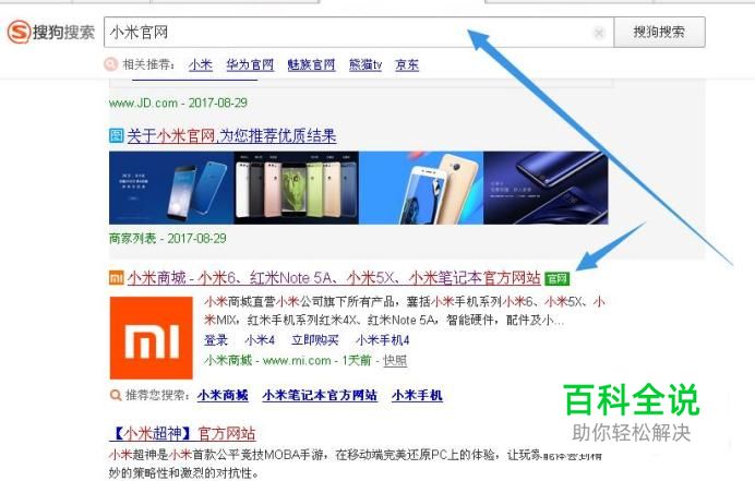 搜索小米官网 打开浏览器,输入小米官网,点击搜索,选择搜索结果中带有官网标志的网页。