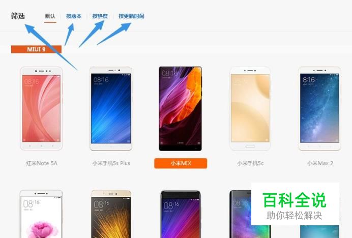 筛选条件 我们也可以根据小米手机系统的版本、热度、更新时间等进行筛选。