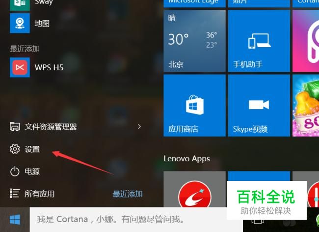 开始菜单下选择设置。