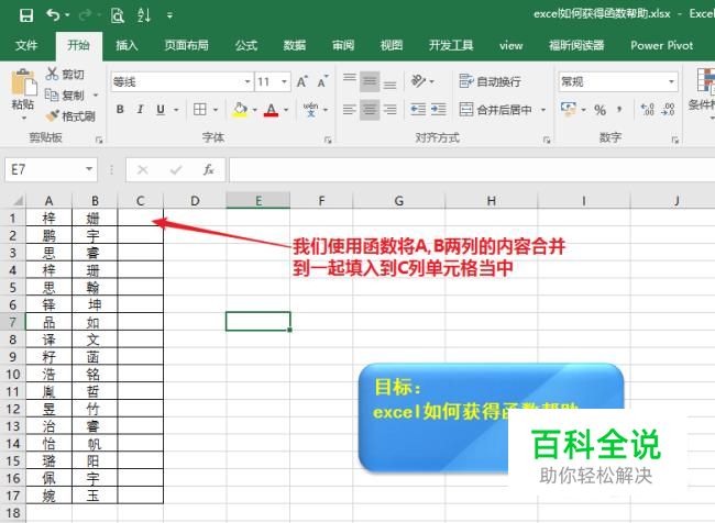 我们使用函数将A,B两列的内容合并到一起填入到C列单元格当中