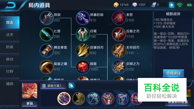 暗影战斧,增加85物攻,15%冷却CD,500生命,在前期能够极大程度缩短技能CD,并且加成物穿,还有减速的被动。