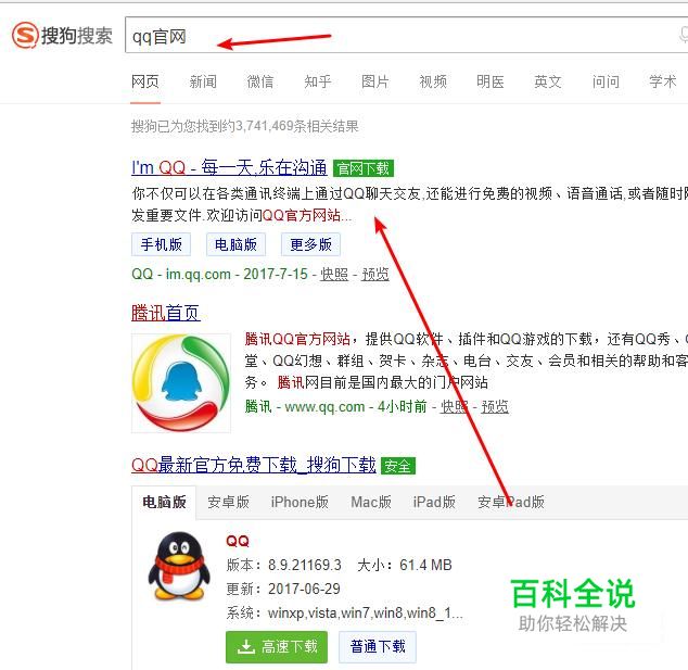 在搜索栏中搜索关键字,qq官网,点击并进入第一个搜索结果。