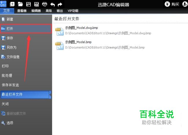 运行安装在电脑里的CAD编辑器,软件打开之后,点击界面“文件”选项,之后再点击“打开”选项,将CAD文件打开。