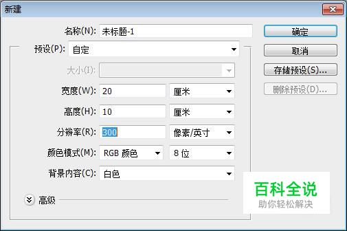 新建一个新的文档,将宽度与高度设为:20×10(厘米)、300像素/英寸、RGB模式。