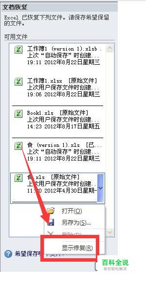 打开之前损坏的excel文档,点击修复,对文档进行修复就可以了。