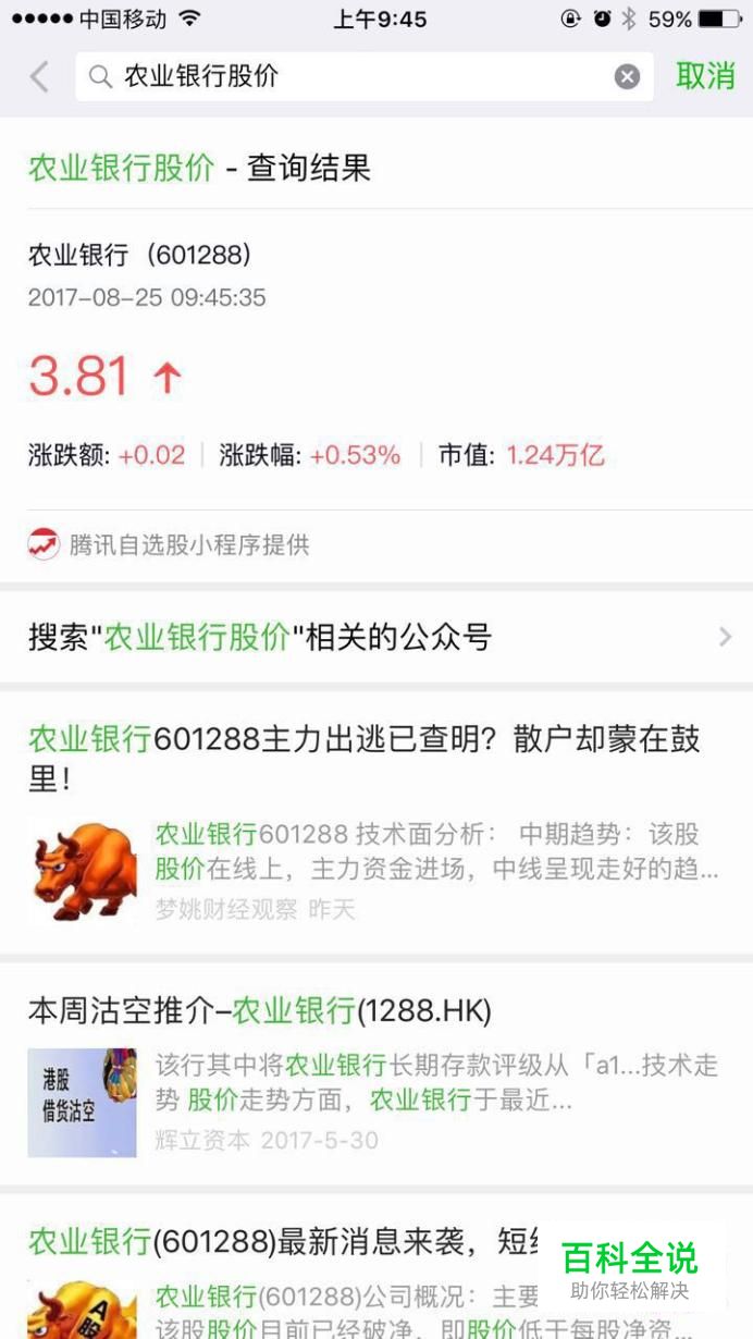 微信可以直接查看股价信息啦 当今社会很多股民朋友只会用“同花顺”等手机APP查看自己的股票涨跌情况。小编想说你OUT了。其实用微信也可以查看股票信息。 只需要你动动手指在微信主界面最上端搜索“股票代码”或者“公司名称+股价”,如“农业银行股价”。