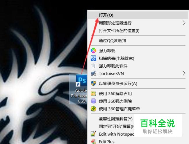 先用手按住【shitf+ctrl+alt】组合键,然后同时右击photoshop,然后点击【打开】,如下图所示。