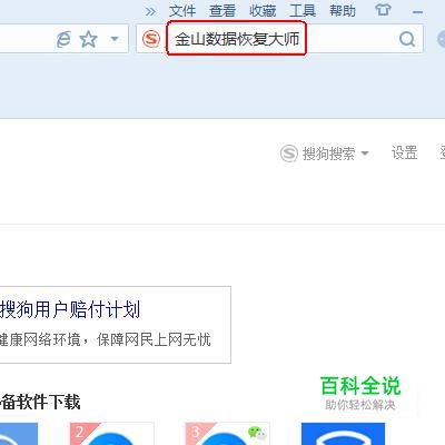 使用搜狗搜索引擎,搜索”金山数据恢复大师“下载并安装。(这里的金山数据恢复大师 ,安装时显示的名称为”互盾数据恢复软件“,安装后快捷方式显示的是”顶尖数据恢复软件“,因此大家在下列图片中看到这三个名称时不要误会为三个软件)