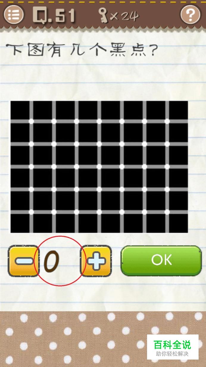 第五十一关,是在让我们寻找这一关中是否有黑点,其实我们眼睛看到的黑点只是眼睛的假象,所以这一关中是没有黑点,一个都没有。