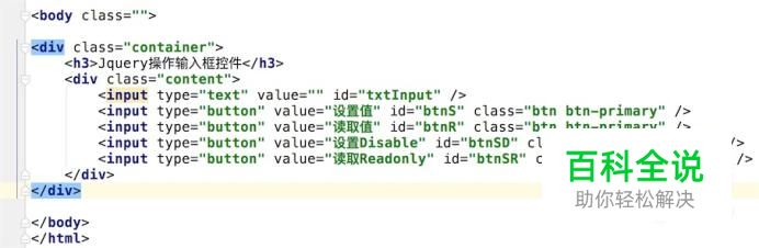 我们先为第一个按钮添加点击事件,点击后,通过Jquery设置输入框的值, 主要是通过Jquery的 val()方法来实现。 $("#txtInput").val('你需要的值'); 代码如图,