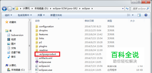 我们到Eclipse的安装目录,这里以笔者的环境为例,在D:\eclipse-SCM-juno-SR2\eclipse下,如图。