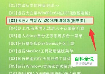 1.将制作好的大白菜u盘启动盘刺进usb接口,重启电脑进入到大白菜主菜单界面,挑选“【03】运转大白菜Win2003PE增强版(旧电脑)”回车承认。如下图所示