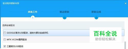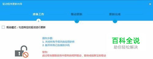 显示驱动更新界面。 小白用户可按提示进行操作。安装驱动前请关闭所有不相关的应用软件,以免冲突。同时断开已连接手机,避免安装后需要重启。完成以上步骤,请在“我已完成以上步骤,同意继续”中打勾,然后点击“下一步”。刷机高手可点击“高级模式”,选择相应的驱动进行更新