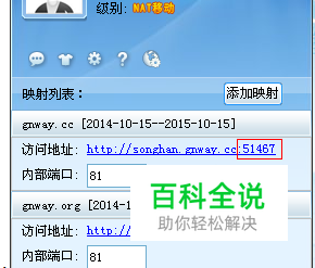单端口映射(即应用程序只有一个端口,如81)首先在软件主界面点击“添加映射”,在弹出的对话框输入应用程序的端口号(81指服务器真实的端口号)点击“确定”,如图表十三,系统会自动生成一个随意虚拟端口(用于外网访问用,如图: