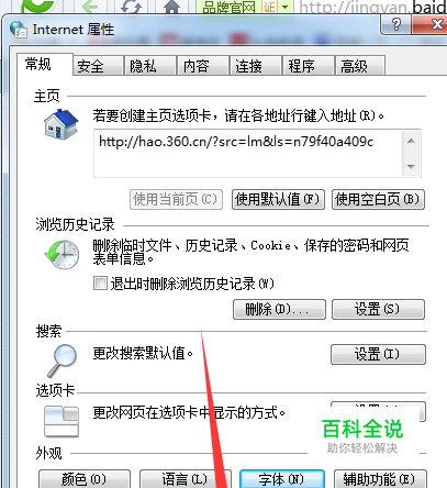 在弹出internet属性窗口,点击常规,找到最下边的【字体】选项,点击进入字体设置。