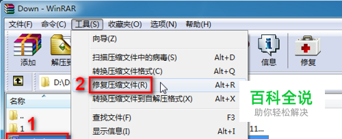 1.打开WinRAR程序,选择已下载好的zip文件,点工具→修复压缩文件。