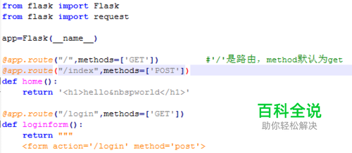 python代码举例: from flask import Flaskfrom flask import request app=Flask(__name__) @app.route("/",methods=['GET']) #'/'是路由,method默认为get@app.route("/index",methods=['POST'])def home(): return '<h1>hello world</h1>' @app.route("/login",methods=['GET'])def loginform(): return """ <form action='/login' method='post'> <p><input name='username'></p> <p><input name='pwd' type='password'></p> <p><button type='submit'>sign in</p> </form> """