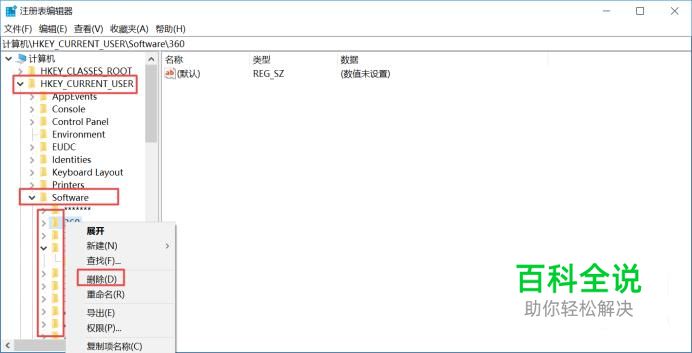 然后我们点击打开HKEY-CURRENT-USER,之后我们点击打开software,里面的所有文件都是软件的注册表,我们想要删除哪个软件的注册表,我们就进行右击该文件夹,弹出的界面,我们点击删除就可以了。