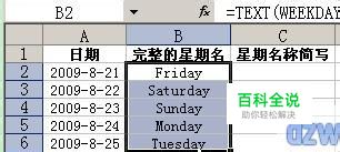 上图中,A列是给出的日期,现在,我们要做的就是,将对应的日期,转换并得出该日期对应的是星期几,并且,要得到英文的星期! 要得到英文的星期,有两种格式,一种是完整的星期名称,一种是简写的星期名称,下面,就让我们一起转换吧! 一、计算出完整的英文星期名称 如下图一样,首先选择B2单元格,然后,在其对应的FX函数输入框中,输入 =TEXT(WEEKDAY(A2),“dddd“) 最后,按下回车键确认,即可得到A2单元格给出的日期所对应的星期几!
