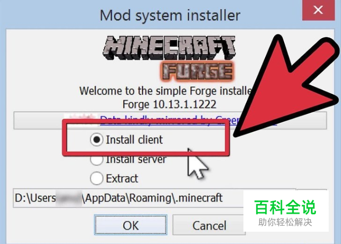 选择“安装客户端”。这会安装你所需要的,在单人模式下加载Mod的必需文件。点击确定。