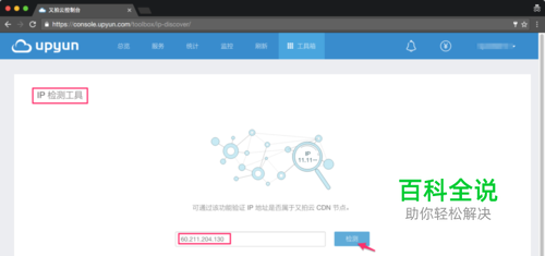 可通过该功能验证 IP 地址是否属于又拍云 CDN 节点。如果属于又拍云 CDN 节点 IP,可以查看到 IP 所属地区及运营商信息。 配置引导 登陆 又拍云管理控制台,在置顶菜单进入 工具箱,找到 IP 检测工具 栏目。如下图所示: