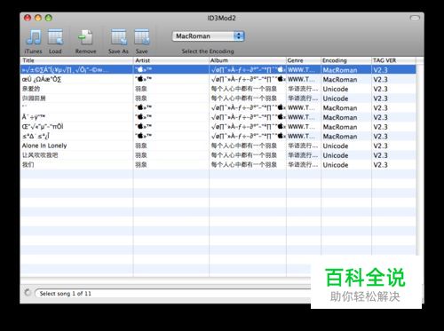 这时候大家就会发现,所有使用非UTF-8编码的(也就是Encoding里不限时Unicode的)曲目都显示出了正确的曲目信息 之前的这些步骤都是告诉软件这些歌应该用哪种编码去解析,而并没有实际的写入文件,所以我们随时可以取消操作而不用担心文件被损坏。一旦我们看到歌曲信息不再乱码了,就说明我们选择了正确的编码,就可以直接点击工具栏上的Save(保存)按钮了。此时所有曲目的ID3信息都将使用UTF-8编码保存到歌曲当中,可以安全的导入到iTunes了。如果还有别的歌曲需要修改编码的,可以点击Remove(移除)按钮后重复上述操作。 ID3Mod2是我找到的最直观、最方便的软件,当然了,它也是一个共享版,注册费用是RMB39元(国外用户是USD11.99),既然是国产软件,对自家人又是如此的便宜,还是建议大家都支持一下正版,这里就不讨论破解的问题,当然了,未注册用户是没有使用时间和功能限制的,唯一的限制是每次只能转6首歌的ID3信息。这个软件可以到官网下载,也可以到这里从论坛下载。 另外,我用的ID3Mod2已经注册过了,所以可以一次性修改很多文件,对于未注册用户,请自行限定每次处理文件的数量。