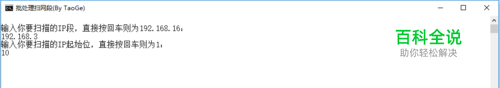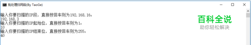 下面我先演示使用过程,最后给出批处理代码。 1.双击运行批处理文件,会弹出一个命令窗口,要求输入IP段,如果不输入,直接按回车的话,则默认为192.168.16段。 这里我输入我的路由分配的IP段,192.168.3并按回车