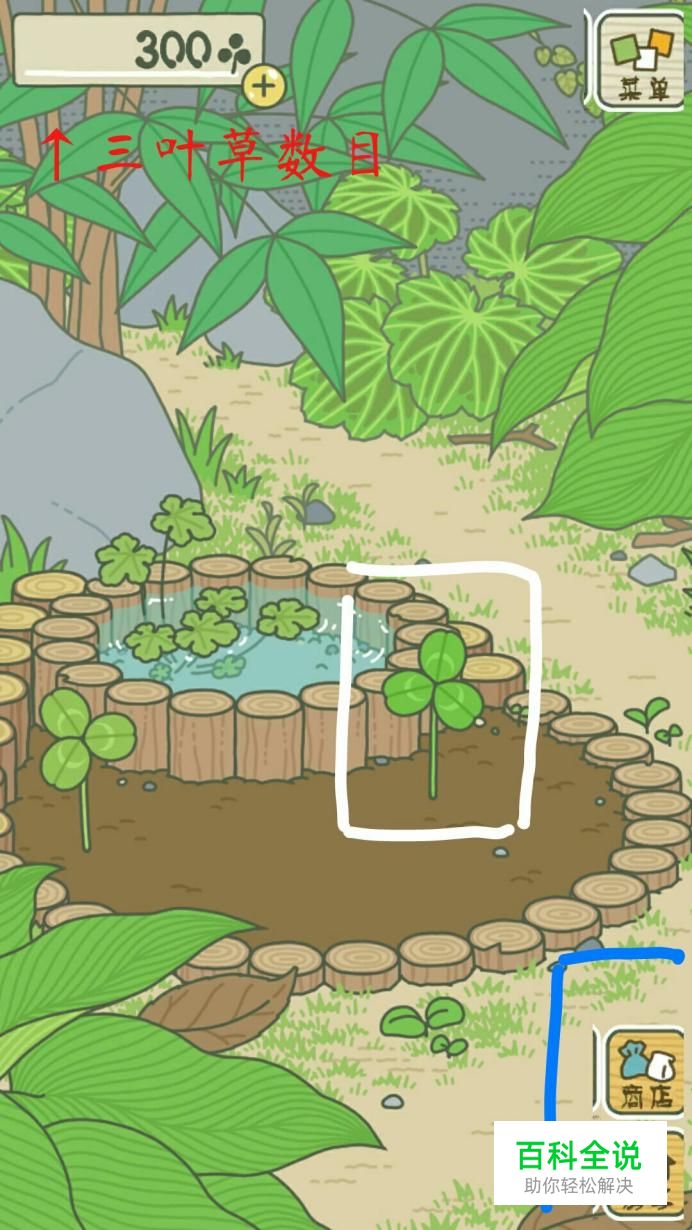 我们打开游戏软件,就可以看到庭院,庭院有三叶草可以收割,大概每三个小时就可以长满一次,三叶草的数目就在左上角可以看到,小编目前有三百个,可以用来购买青蛙旅行的食物和装备,幸运的话,还可以得到四叶草,四叶草可以作为青蛙旅行的护身符点击右下方(即蓝色区域)可以去往“商店”和“房子”。