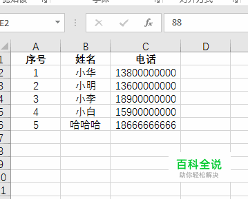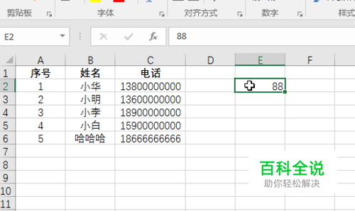 任意选一个单元格,输入我们需要添加的数字88 ,我们选“E2”单元格输入88