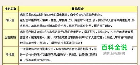 在来说说雷系技能:技能名称 技能简介晴天雷 满级后是85%法术外加200点的雷电伤害,命中后70%的机率麻痹6秒。 在配合神通的晴天霹雳,麻痹几率提升10%,持续时间增加1秒,共3级和天雷淬体满级也是150点伤害。加起来是350点附加雷系伤害,伤害不比离火剑差,而且贵在瞬发。 五雷轰顶 满级后应该是75%法术攻击伤害并使6秒的麻痹状态,雷系群攻,施法2秒。(对应的通神有五雷正法,施法时缩0.2秒,同时造成的伤害提升2%共5级和天雷定身,25%的几率向目标附加2秒的定身效果,共4级。打混战时也是不错的技能) 旱地雷 一道雷电将对方打到半空中,60%法术攻击命中后目标致残,持续4秒。施法1秒,冷却2分(每升一级+10%的法术攻击和效果维持1秒,共5级。也是很BT的技能)对应的神通技能有心雷辅身,致命率提升2%共5级。