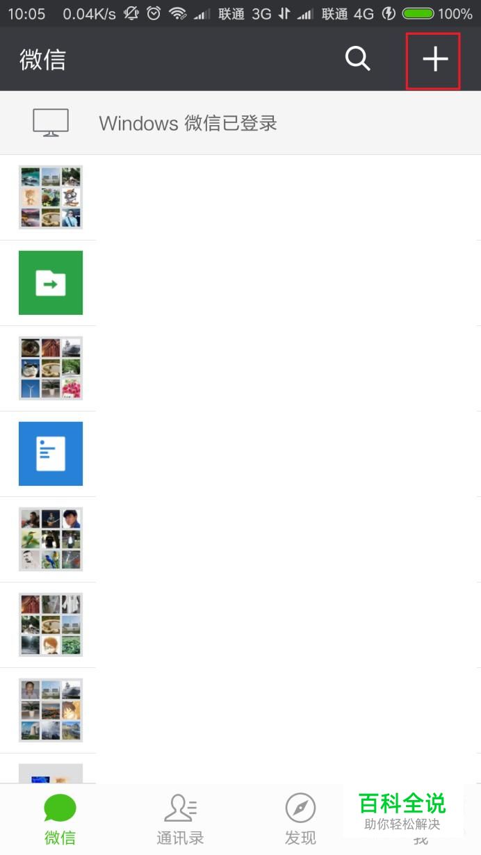 首先,打开微信应用软件主页面,点击页面顶部“+”按钮。