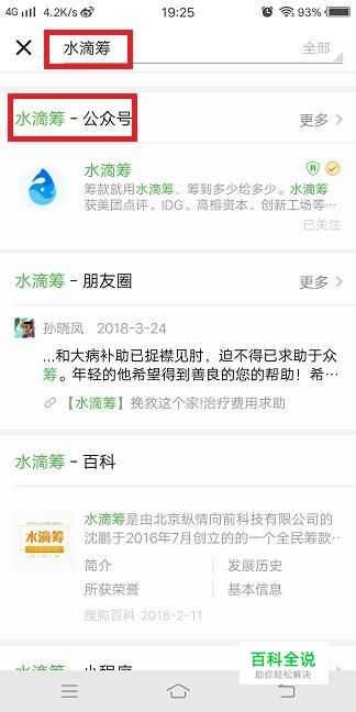 在搜索栏中输入“水滴筹”进行搜索,在搜索结果中找到“水滴筹公众号”点击进入,如图所示