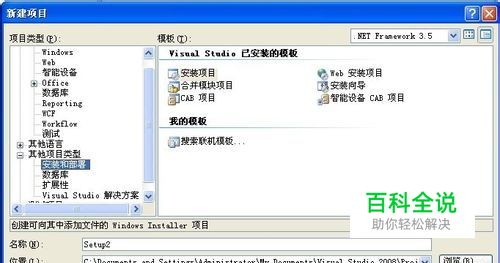 打开开发环境VS2008,新建项目,选择其他项目类型,再选择"安装项目",输入名称及选择安装路径;