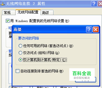 然后,点击主机的无线网络连接属性窗口的 “无线网络配置”,选中“用windows配置我的无线网络设置”,点击下方的“高级”,在要访问的网络里,勾上“仅计算机到计算机(待定)”,不要勾选“自动连接到非首选的网络”。如图二所示: