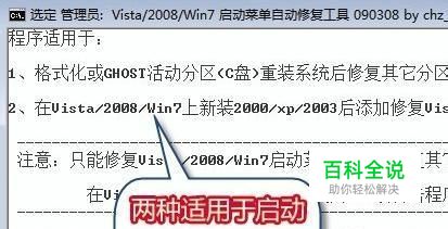 2、程序会列举出两种适用的情况,例如格式化或者GHOST覆盖后,修复其他分区上的Windows Vista、2008、7系统;例如XP+Windows7双系统重装XP后丢失Windows7引导等。敲一下键盘上的回车键,完成操作。