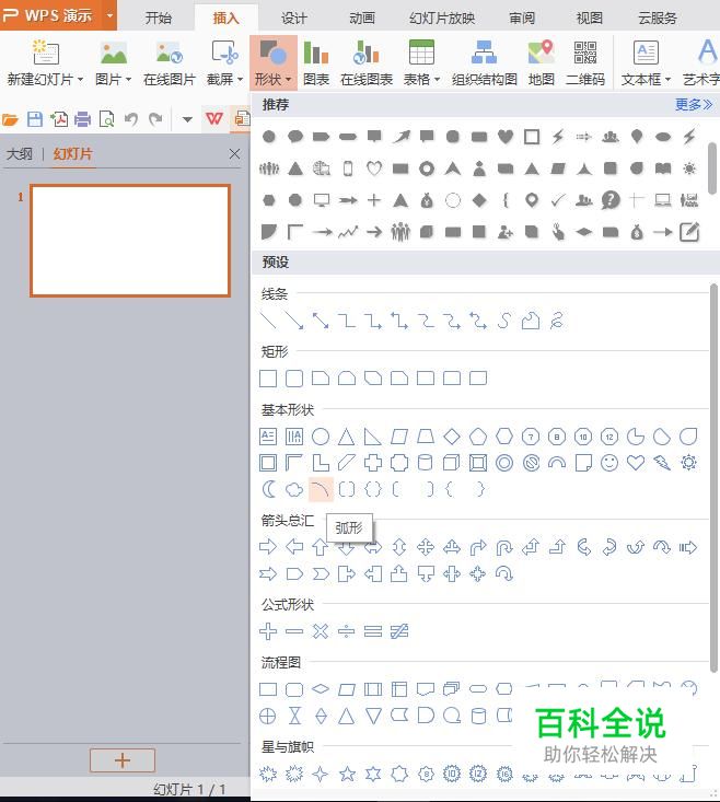 首先打开一个PPT,在上面一排中选择“插入'选项卡,找到形状,在基本形状中找到弧形,点击添加。