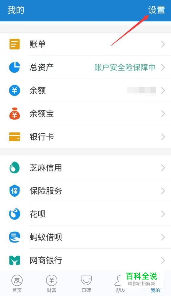 首先我们先打开手机版支付宝,打开之后单击”我的“按钮,然后会进入到如图所示面板,此时我们单击面板上的”设置“按钮。