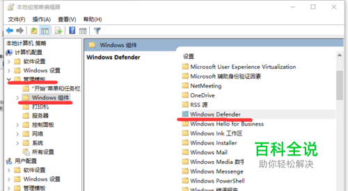 进入组策略,选择计算机配置>管理模板>Windows 组件>Windows Defender.