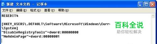 在文本文档中输入下列代码: REGEDIT4[HKEY_USERS\.DEFAULT\Software\Microsoft\Windows\CurrentVersion\Policies\System] "DisableRegistryTools"=dword:00000000 "NoAdminPage"=dword:00000001
