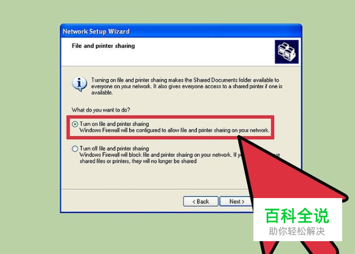 当向导提示选项时,选择“启用文件共享”。选择该选项后,将在您的所有计算机上创建一个“共享文档”文件夹。 所处网络中的所有用户都可以访问“共享文档”文件夹中的文件。在 Windows XP 中,无法对文件夹以外的单个文件设置共享。