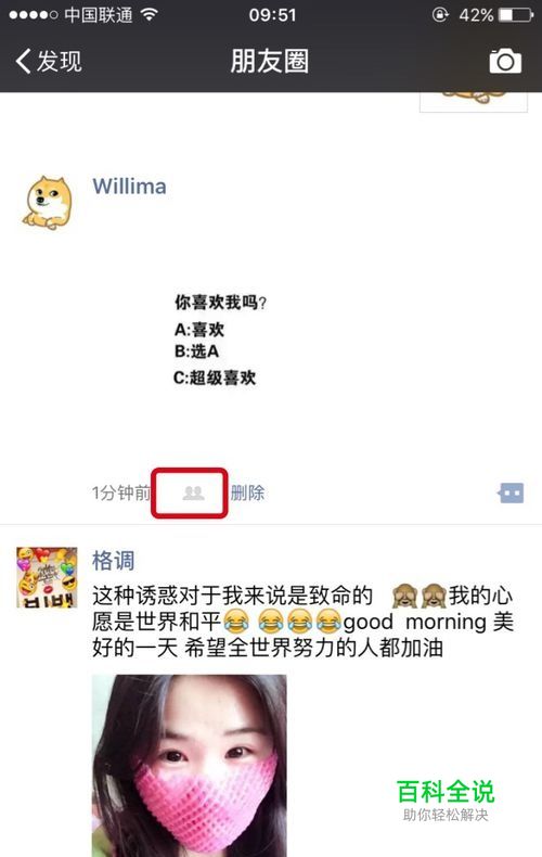发布完之后到朋友 圈就可以看到我们刚才发布的朋友 圈消息了,这时候我们发现这条消息下面一个两个小人的图标。