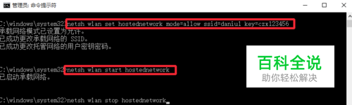 创建无线WiFi热点,关键是两个内容,一个是创建无线WiFi名称,一个是无线WiFi密码,命令提示符中直接输入命令:netsh wlan set hostednetwork mode=allow ssid=daniu1 key=czx123456 这里的 命令中ssid后面的是你的无线WiFi名称,key后面的是自己的无线wifi密码,可以根据自己需要设置,当然也可以将这里的命令直接复制粘贴到命令提示符窗口中,然后回车运行命令。