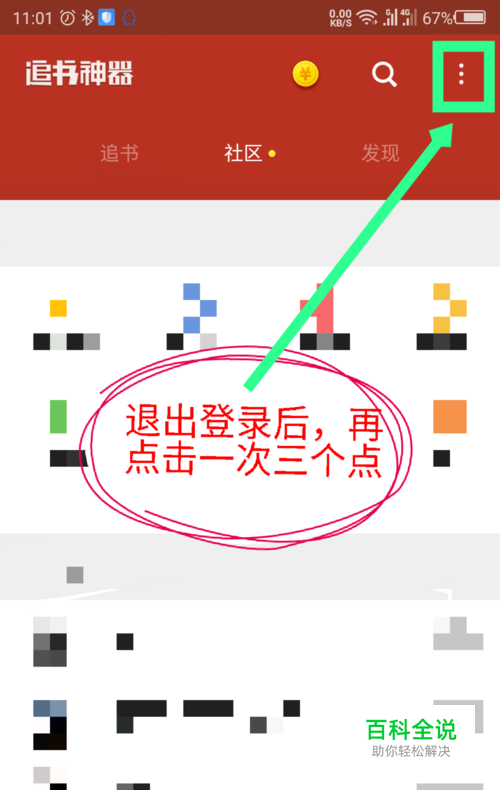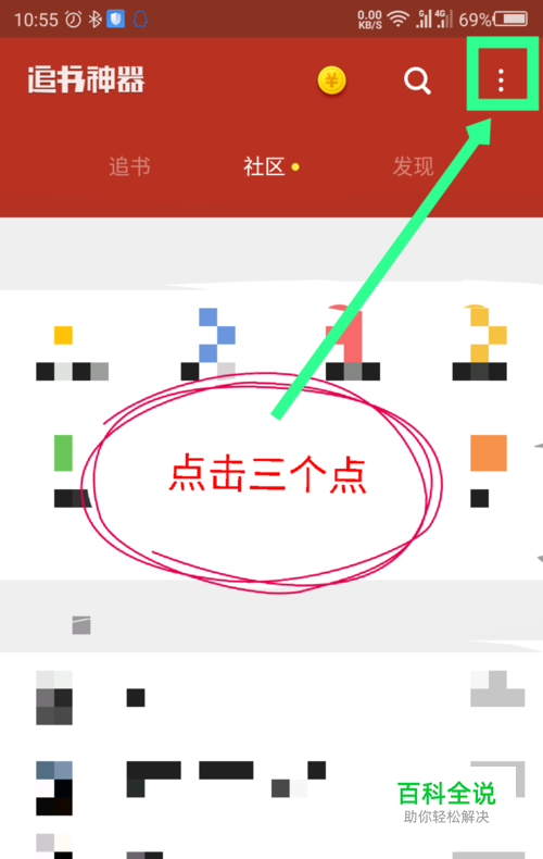 打开追书神器后,点击右上角的三个点图标。如图所示