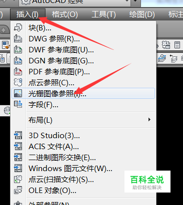 按照下图所示,点击菜单栏上的“插入”,弹出下拉菜单,找到“光栅图像参照”并单击