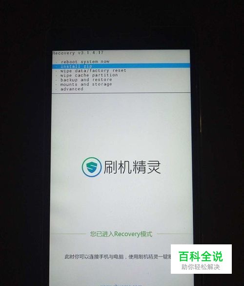手机进入recovery模式。 按音量键加和电源键进入recovery。