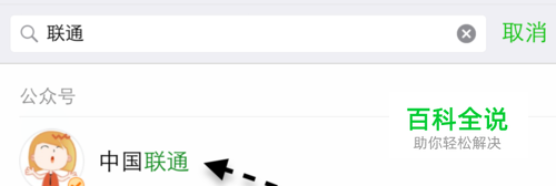 我这里以联通的手机为例,至于电信和移动的也可以参考此方法来实现。首先我们在微信上搜索 “联通”关键字,便会出现中国联通的公众号,点击打开它。