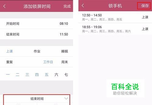 第二步、在“锁屏时间”页面,点击添加按钮“+”,弹出页面;选择“上课”、“作业”、“睡眠” 三个内容进行选择工作日或周末,并对应进行时间段的设置(开始时间和结束时间),设置好后,点击“完成”按钮;