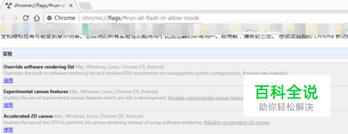 然后再在浏览器的地址栏输入:chrome://flags/#run-all-flash-in-allow-mode,可以看到里面有很多的设置。
