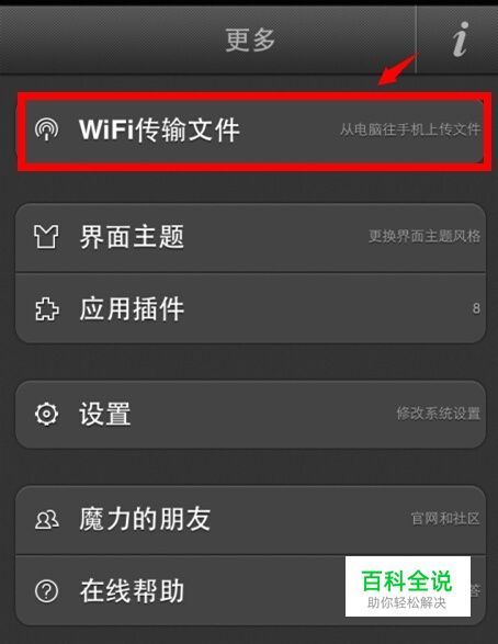 打开【MoliPlayer】,可以看到【WiFi传输文件】选项。