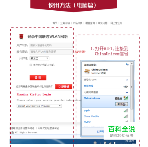 打开手机或电脑设置里的WIFI搜索,搜索附近有没有ChinaUnicom信号,如果有试下可不可以连接上,连上后,打开手机电脑或者手机的浏览器任意网址会显示ChinaUnicom的登录页面,页面上要登录帐号,密码,还在开户地可供选择。(以上也是使用的基本条件),帐号和密码要从那里获取呢?请看下一步。。。。
